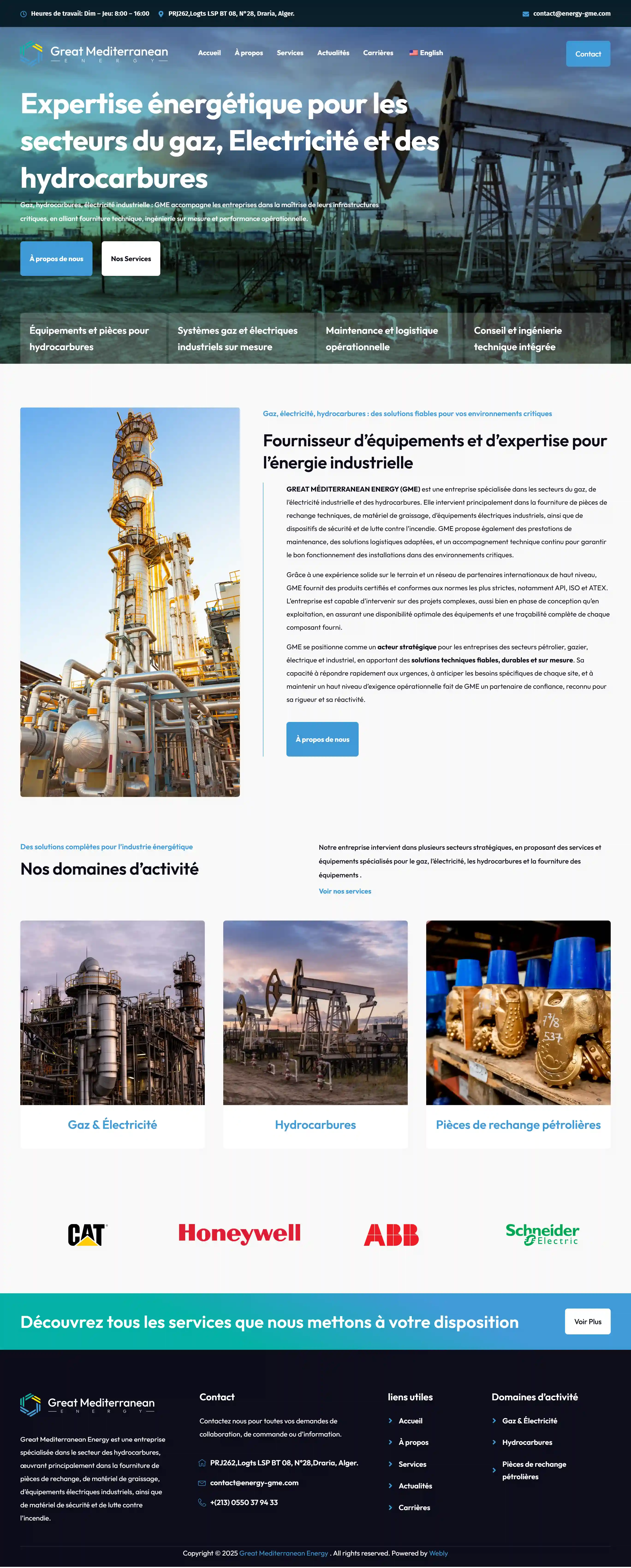 Great Mediterranean Energy (GME) is a leading Algerian company specializing in energy infrastructure solutions, with expertise in gas, hydrocarbons, and industrial electricity. GME delivers reliable services for the design, installation, and maintenance of critical energy systems, helping industrial clients operate with maximum efficiency and safety. By combining cutting-edge technology with highly skilled teams, the company ensures compliance with international energy standards while supporting the sustainable growth of Algeria’s industrial sector. Recognized for its professionalism and technical expertise, GME plays a pivotal role in driving energy performance and innovation in the region.
